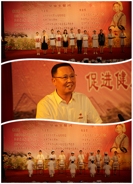 授帽傳光儀式結(jié)束后,全體畢業(yè)生在護(hù)理系吳婷婷老師的帶領(lǐng)下齊聲宣讀畢業(yè)誓言。莊嚴(yán)的宣誓,鏗鏘有力的聲音久久縈繞在會(huì)場(chǎng)上空,昭示著他們正式加入白衣天使的行列。其后,學(xué)生代表丁冠初和楊情情同學(xué)情緒激昂,感情真切,對(duì)學(xué)校與老師的關(guān)心和栽培表達(dá)了深摯的感激之情;教師代表吳美丹老師深情地回憶了同學(xué)們?cè)诔砷L(zhǎng)中的點(diǎn)滴進(jìn)步和許多平凡的感動(dòng),并向同學(xué)們提出了殷切的期望。今年,護(hù)理系還特別邀請(qǐng)了家長(zhǎng)代表到場(chǎng),兩位家長(zhǎng)代表分別發(fā)言,表達(dá)了對(duì)學(xué)校和老師的感激之情,也提出了對(duì)孩子的期望。學(xué)生向家長(zhǎng)獻(xiàn)上鮮花并熱烈擁抱,現(xiàn)場(chǎng)場(chǎng)面溫馨感人,傳遞著感動(dòng)、感恩的暖意,令所有人動(dòng)容,將畢業(yè)典禮推向高潮。