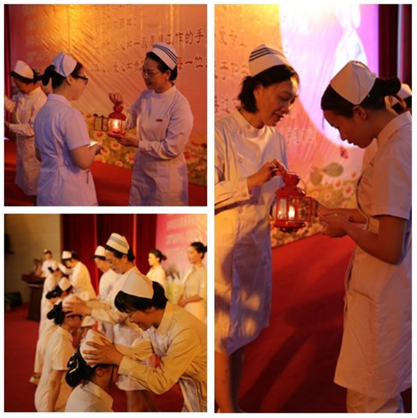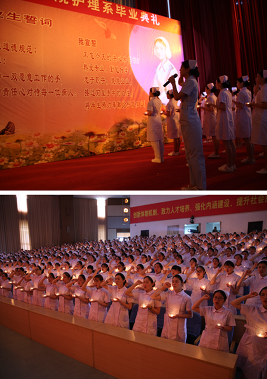 畢業(yè)典禮在雄壯的國(guó)歌聲中拉開(kāi)序幕。首先由教務(wù)處姜華萍副處長(zhǎng)宣讀2018屆畢業(yè)生名單、優(yōu)秀畢業(yè)生名單和職業(yè)技能能手的表彰決定,諸位領(lǐng)導(dǎo)為他們頒發(fā)證書(shū),希望受表彰的同學(xué)再接再厲,在新的崗位上建功立業(yè)。接下來(lái),由五位資深護(hù)理前輩朱靜露教授、護(hù)理系原系主任劉登蕉教授、護(hù)理系原系副主任劉珍紅副教授、學(xué)院副院長(zhǎng)鄭翠紅教授、護(hù)理系副主任龔海蓉副教授為畢業(yè)生授帽、傳光。在護(hù)理學(xué)創(chuàng)始人南丁格爾像前,護(hù)理前輩們?yōu)楫厴I(yè)生戴上象征著圣潔天使的燕尾帽,畢業(yè)生接過(guò)老師手中象征南丁格爾精神的奉獻(xiàn)之火。輕柔的音樂(lè)、柔和的燈光,白色的燕尾帽在燭光的映襯下猶如神圣的光環(huán)照耀在每一個(gè)現(xiàn)場(chǎng)師生的心中。