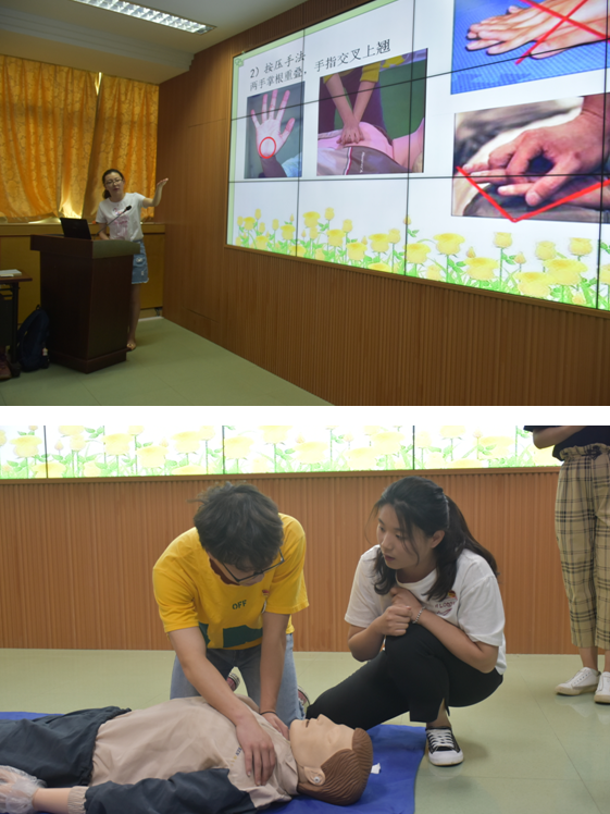 活動現(xiàn)場,紅十字會學生分會的急救知識技能培訓吸引了大批福信院師生前來學習,在志愿者們的講解下,大家了解到CPR、不同部位的傷口包扎、足踝扭傷及動脈出血等急救方法。志愿者們邀請在場師生進行急救情節(jié)模擬和急救技能操作,生動活躍的現(xiàn)場氣氛迅速拉近了兩校之間同學們的距離。