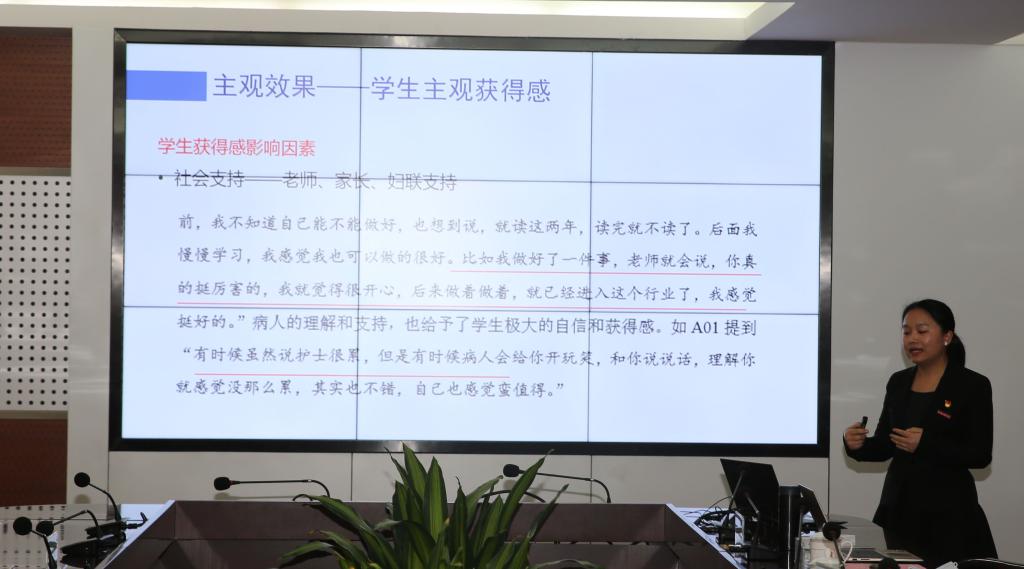 課題組從研究背景與問題、研究內(nèi)容與方法、研究結(jié)論與對策、研究成果與影響、研究的不足之處五個方面詳細匯報了課題研究任務(wù)的完成情況。與會專家肯定了該課題的研究成效,認為以醫(yī)藥衛(wèi)生類職業(yè)教育精準(zhǔn)扶貧為研究案例,探索學(xué)校、政府、企業(yè)、社會四方協(xié)同合作的模式與職業(yè)教育精準(zhǔn)扶貧的路徑與對策,一定程度上補充了目前醫(yī)藥衛(wèi)生類職業(yè)院校在政府、學(xué)校、企業(yè)及社會合作辦學(xué)研究的不足,對脫貧攻堅工作也具有一定的理論指導(dǎo)和實踐推廣意義。建議課題后續(xù)研究中,可將已探索的校政企社多元共促模式擴大應(yīng)用到其他專業(yè),并向同類職業(yè)院校輻射應(yīng)用。