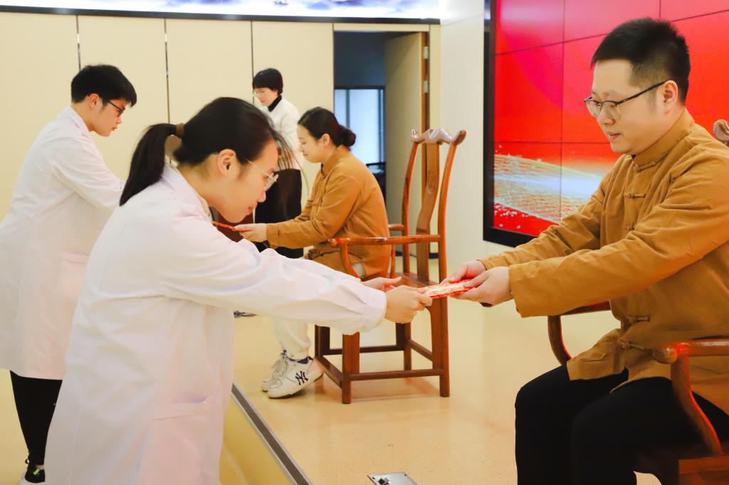 師承教育是中醫(yī)藥人才培養(yǎng)的主要模式,在傳承中醫(yī)藥學(xué)術(shù)思想、臨床經(jīng)驗方面發(fā)揮著不可替代的重要作用,而拜師是對中華醫(yī)學(xué)的繼承。學(xué)生們依次向自己的導(dǎo)師鞠躬行禮、呈拜師帖、奉茶、獻花。