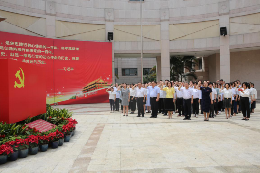 “奮斗百年路 啟航新征程?!痹趫A形廣場,院直機(jī)關(guān)黨總支組織黨員干部重溫入黨誓詞,面向鮮紅的黨旗莊嚴(yán)宣誓。