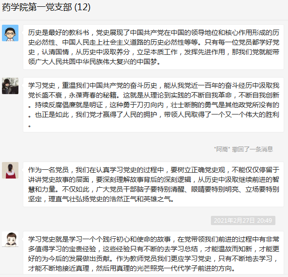 為深入貫徹習(xí)近平總書記在黨史學(xué)習(xí)教育動(dòng)員大會(huì)上的重要講話精神,引導(dǎo)支部黨員學(xué)史明理、學(xué)史增信、學(xué)史崇德、學(xué)史力行,2021年2月27日,藥學(xué)院第一黨支部在線上開展“學(xué)黨史、守初心、強(qiáng)黨性、擔(dān)使命”主題黨日活動(dòng),活動(dòng)由支部書記何舒瀾主持。