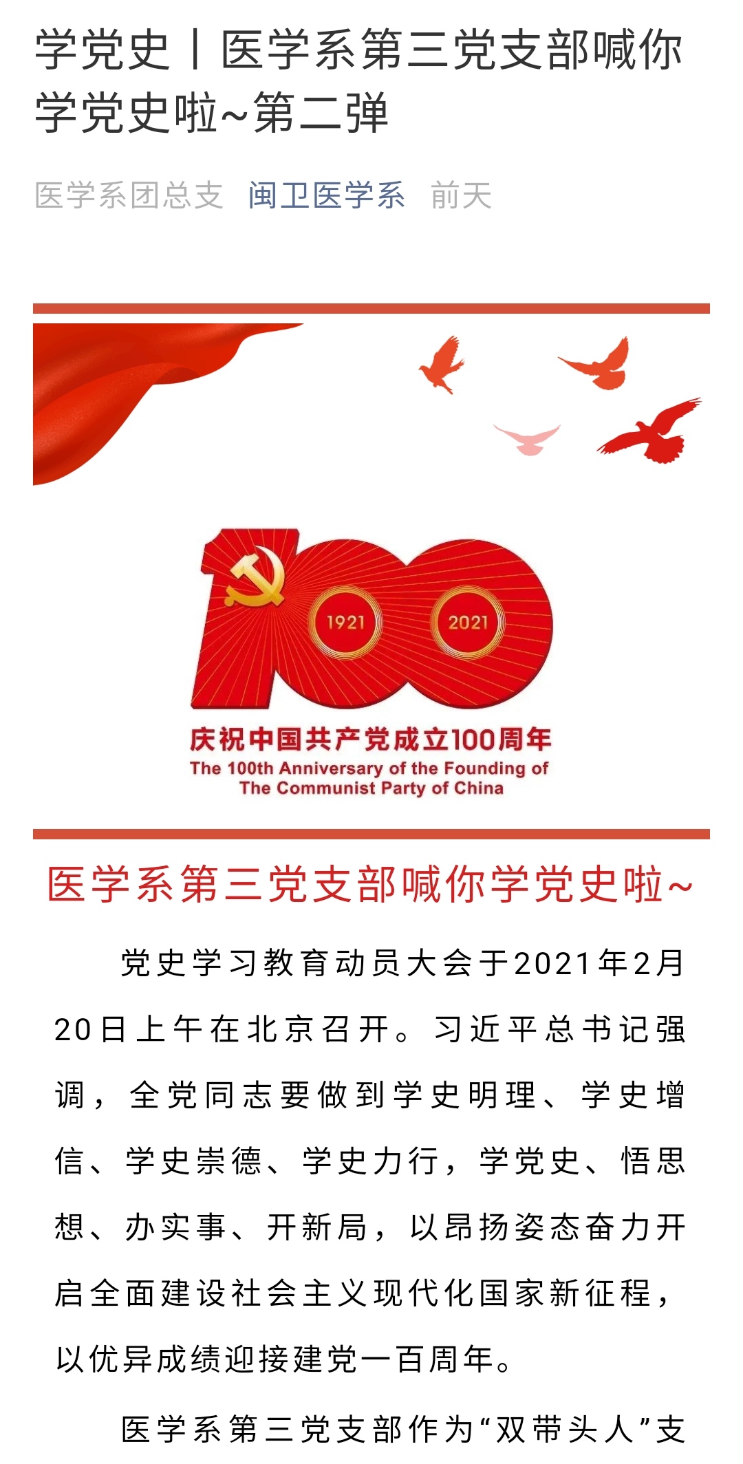 為深入開展黨史學(xué)習(xí)教育,進(jìn)一步增強(qiáng)支部黨員的理想信念和責(zé)任感,近期醫(yī)學(xué)系第三黨支部積極陸續(xù)開展黨史學(xué)習(xí)教育系列活動,以實(shí)際行動迎接中國共產(chǎn)黨成立100周年。