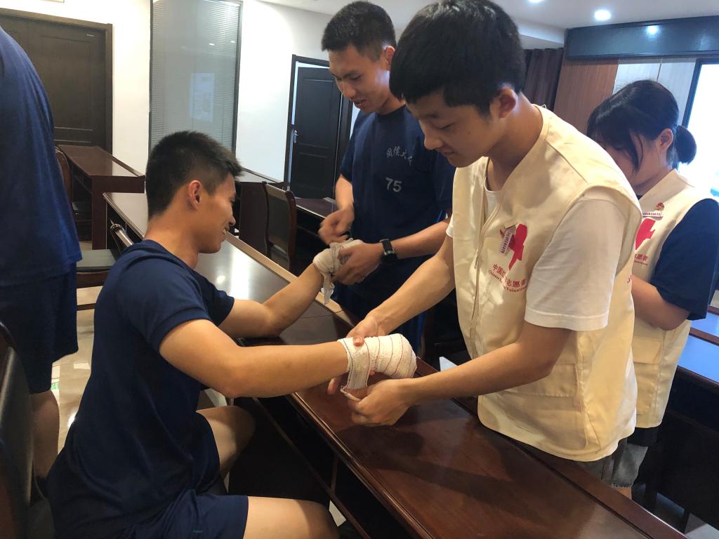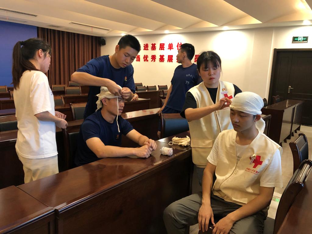 活動開始,由醫(yī)學(xué)系紅十字會負(fù)責(zé)人王婷同學(xué)為消防員們詳細(xì)講解繃帶三角巾包扎法的理論知識,其余同學(xué)依次演示急救中常用的頭部、胸部、手部、膝蓋等部位的三角巾包扎手法。隨后,消防員們兩人一組在同學(xué)們的指導(dǎo)下進(jìn)行包扎實踐訓(xùn)練。最后,師生現(xiàn)場為消防員們提供刮痧拔罐義診活動。
