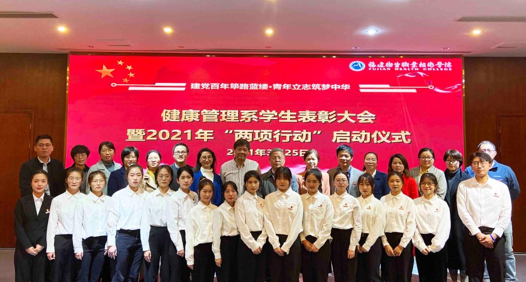 2021年3月25日下午,健康管理系以“建黨百年篳路藍(lán)縷,青年立志筑夢中華”為主題,舉行學(xué)生表彰大會暨2021年“兩項(xiàng)行動”啟動儀式,大會表彰了2019~2020學(xué)年先進(jìn)集體和先進(jìn)個人,啟動了健康管理系2021年迎接建黨100周年“建黨百年”行動和“學(xué)生管理質(zhì)量提升”行動。校領(lǐng)導(dǎo)陳貞健副院長出席活動并講話,學(xué)工部副部長張麗萍、系關(guān)工委鄭向紅主任、王屏副主任、伍麗萍老師,系黨政班子成員及全體教職工和學(xué)生代表400多人參加活動。