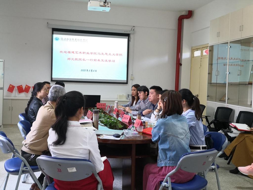2021年5月6日上午,福建藝術(shù)職業(yè)學(xué)院馬克思主義學(xué)院院長(zhǎng)鄭元?jiǎng)P一行5人來我校馬克思主義學(xué)院進(jìn)行調(diào)研交流,馬克思主義學(xué)院院長(zhǎng)熊美蘭熱情接待并在行政樓辦公室107開展調(diào)研交流座談會(huì)。