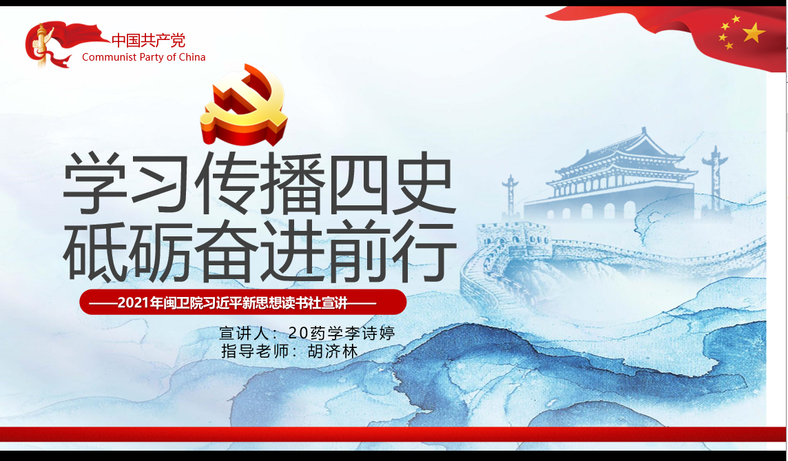 2021年5月10日下午,習(xí)近平新時(shí)代中國(guó)特色社會(huì)主義思想讀書(shū)社宣講團(tuán)在胡濟(jì)林老師指導(dǎo)下,前往20級(jí)藥學(xué)305-307班開(kāi)展宣講活動(dòng),此次宣講人是李詩(shī)婷,她宣講的主題是“學(xué)習(xí)傳播‘四史’ 砥礪奮進(jìn)前行”。