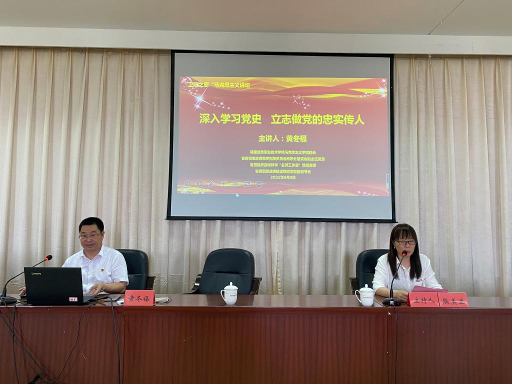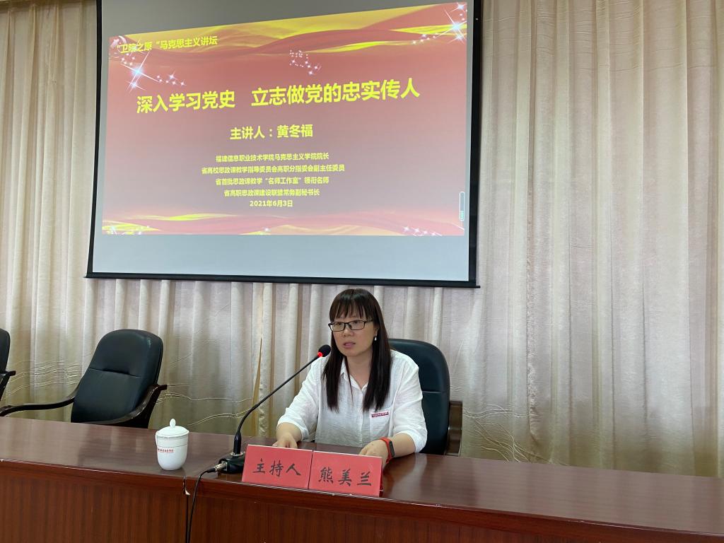 為深入學(xué)習(xí)貫徹落實(shí)習(xí)近平總書記在黨史學(xué)習(xí)教育動(dòng)員大會(huì)上重要講話精神,貫徹落實(shí)省委部署的“再學(xué)習(xí)、再調(diào)研、再落實(shí)”活動(dòng),舉辦學(xué)黨史專題學(xué)習(xí),特別邀請(qǐng)福建信息職業(yè)技術(shù)學(xué)院馬克思主義學(xué)院院長(zhǎng)黃冬福于2021年6月3日來(lái)我校開展《深入學(xué)習(xí)黨史 立志做黨的忠實(shí)傳人》的專題宣講。講座由我校馬克思主義學(xué)院院長(zhǎng)熊美蘭主持,百余名師生參與講座。