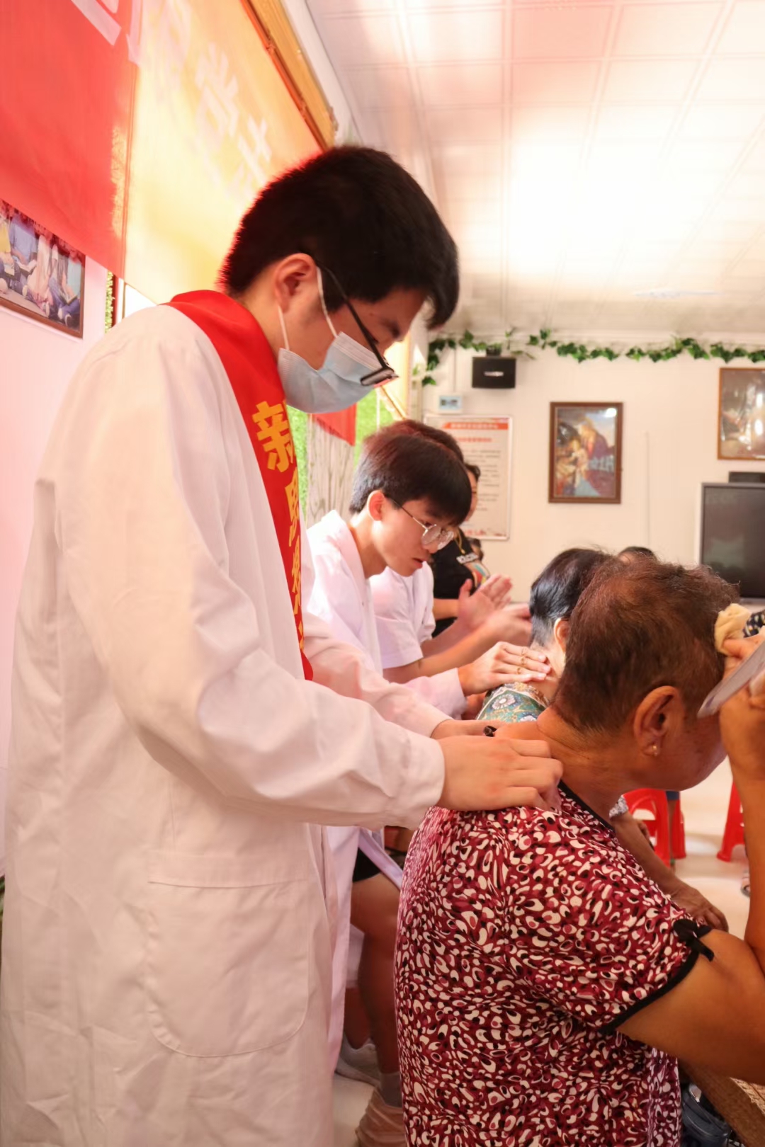 新時(shí)代的青年要在為人民服務(wù)中茁壯成長(zhǎng),要在社會(huì)實(shí)踐中增長(zhǎng)工作本領(lǐng),要用行動(dòng)證明新時(shí)代的中國(guó)青年是好樣的!本次“三下鄉(xiāng)”開(kāi)展了送醫(yī)送藥活動(dòng),21位醫(yī)學(xué)生們各盡其能,發(fā)揮所長(zhǎng),為村民提供問(wèn)診、推拿、拔罐、量血壓、測(cè)心率、健康咨詢等醫(yī)療服務(wù),進(jìn)行心肺復(fù)蘇、海姆立克急救法和常見(jiàn)傷口繃帶包扎的現(xiàn)場(chǎng)演示講解,對(duì)預(yù)防高血壓、糖尿病等常見(jiàn)慢性疾病進(jìn)行健康知識(shí)宣講,糾正村民健康保健常識(shí)誤區(qū),同時(shí)現(xiàn)場(chǎng)還為村民分發(fā)自制的防暑香囊,分發(fā)《衛(wèi)生條例手冊(cè)》等宣傳冊(cè),進(jìn)一步提高村民的健康意識(shí)、普及健康科學(xué)知識(shí)。義診活動(dòng)特邀我校中醫(yī)康復(fù)技術(shù)專業(yè)負(fù)責(zé)人郭潔梅博士參與,她耐心問(wèn)診,對(duì)“癥”分別施以推拿、刮痧、拔罐。雖然天氣酷熱,但村民聞?dòng)嵓娂娗皝?lái),活動(dòng)場(chǎng)面火爆。本次活動(dòng)發(fā)揮專業(yè)優(yōu)勢(shì),共為百余位村民提供診療,派發(fā)宣傳冊(cè)約200份,深受村民好評(píng),同時(shí)也是我校黨史學(xué)習(xí)教育與服務(wù)群眾的生動(dòng)結(jié)合,在實(shí)踐中錘煉了我校醫(yī)學(xué)生的能力與意志。