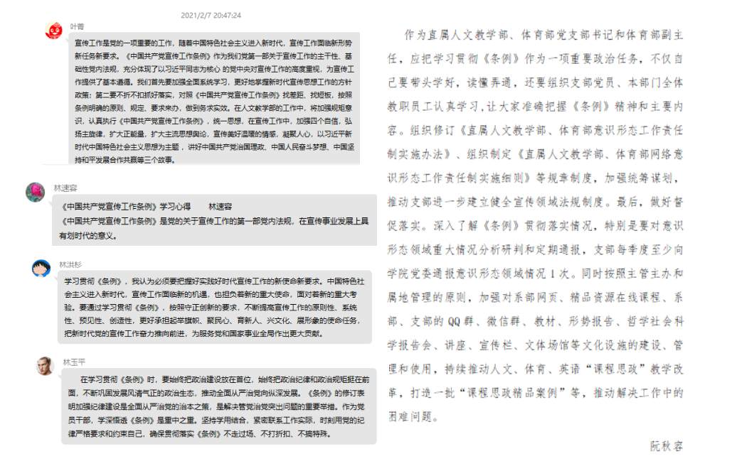 2月7日晚上,直屬人文教學(xué)部和體育部黨支部線上召開中心組學(xué)習(xí)(擴(kuò)大)會議,專題組織學(xué)習(xí)《中國共產(chǎn)黨宣傳工作條例》(以下簡稱《條例》)和傳達(dá)全國宣傳部長會議精神,會議由直屬人文教學(xué)部和體育部黨支部書記阮秋容同志主持,人文教學(xué)部和體育部領(lǐng)導(dǎo)班子、直屬黨支部支委委員、系辦人員等參加了會議。