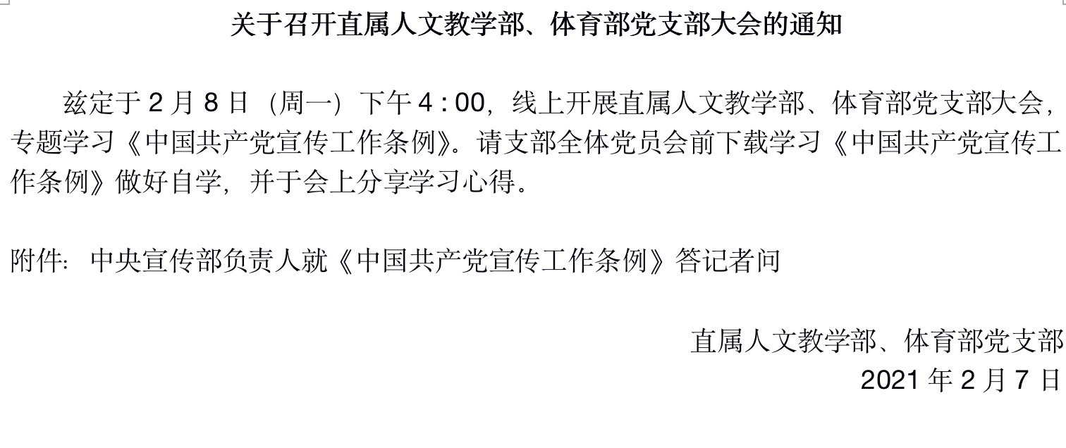 2月8日下午,直屬人文教學部和體育部黨支部在黨支部Q群召開線上黨員大會,專題組織學習《中國共產黨宣傳工作條例》(以下簡稱《條例》)和傳達全國宣傳部長會議精神,本次會議由直屬人文教學部和體育部黨支部阮秋容主持,支部全體黨員參加了會議。