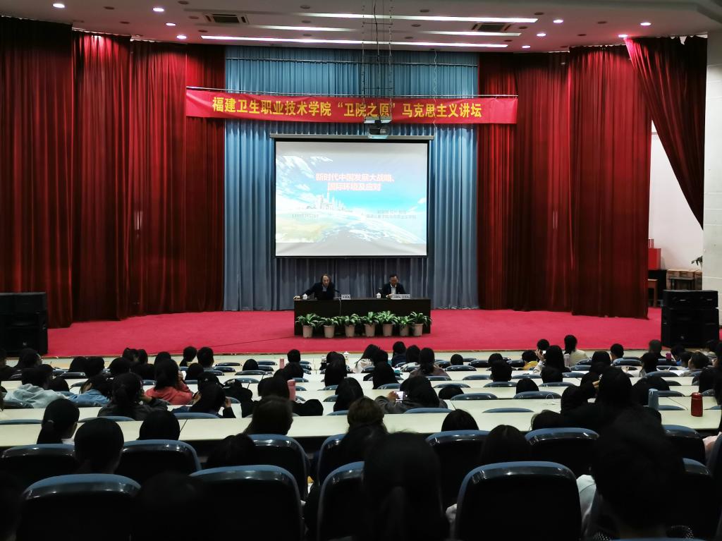 為深入開展“不忘初心、牢記使命”主題教育,增強(qiáng)我校師生的初心使命意識(shí)和勇于擔(dān)當(dāng)作為的歷史責(zé)任感、使命感和緊迫感,11月28日下午,我?!靶l(wèi)院之原”馬克思主義論壇在學(xué)術(shù)報(bào)告廳舉行。本次論壇邀請(qǐng)福建江夏學(xué)院馬克思主義學(xué)院院長(zhǎng)郭健彪教授為我校師生“新時(shí)代中國的發(fā)展大戰(zhàn)略及當(dāng)下面對(duì)的國際環(huán)境”專題講座。講座由校黨委書記曾武祈主持,校黨委副書記李美華、各系部、學(xué)工處和團(tuán)委中層干部、全體輔導(dǎo)員、馬院全體教師、護(hù)理系學(xué)生代表、管理系學(xué)生代表及社團(tuán)學(xué)生代表參加了此次活動(dòng)。
