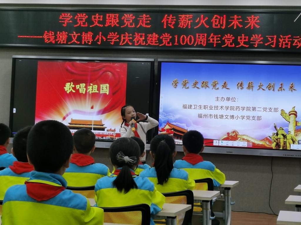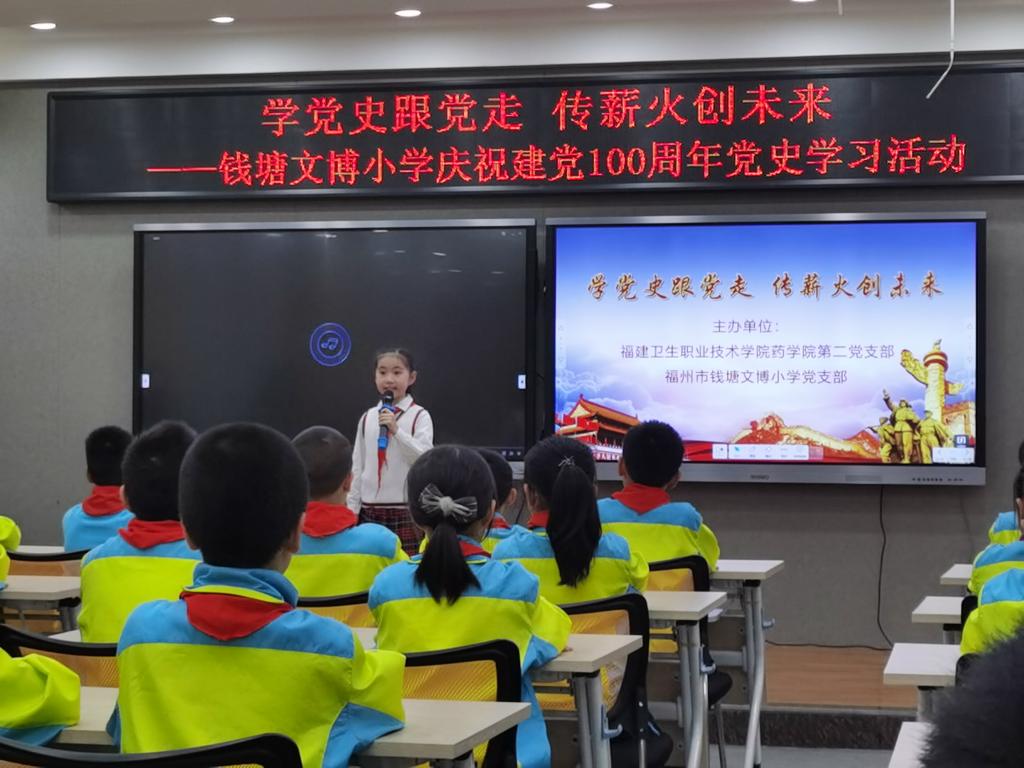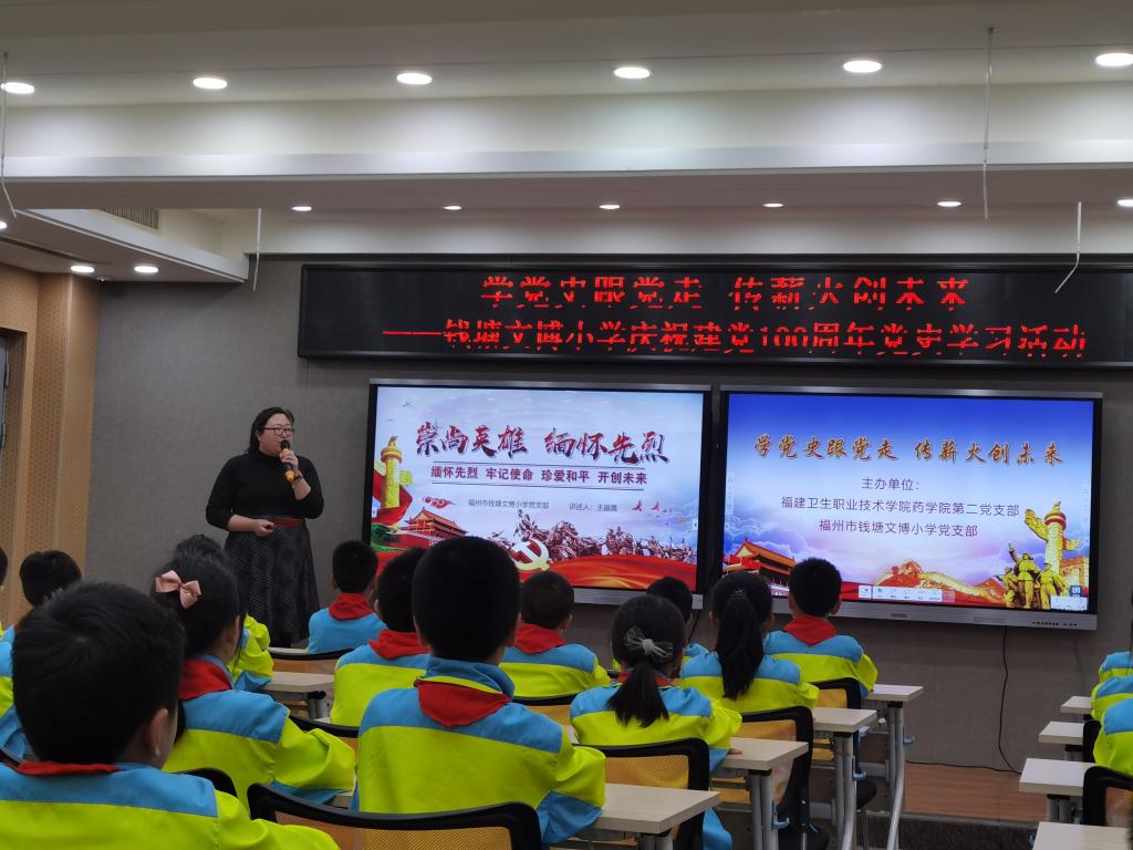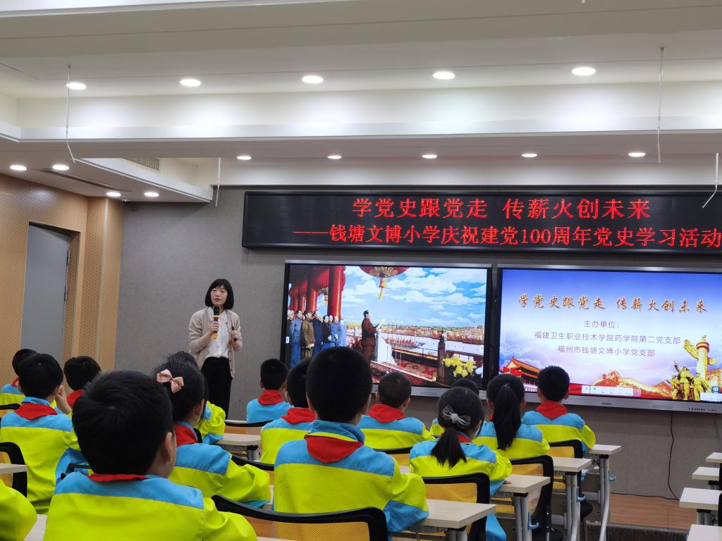 2021年4月16日下午,我校藥學(xué)院第二黨支部與福州市錢塘文博小學(xué)黨支部聯(lián)合開展了以“學(xué)黨史跟黨走,傳薪火創(chuàng)未來”為主題的黨史學(xué)習(xí)教育。其余未能到現(xiàn)場的師生,通過現(xiàn)場直播的方式同步線上參與活動。