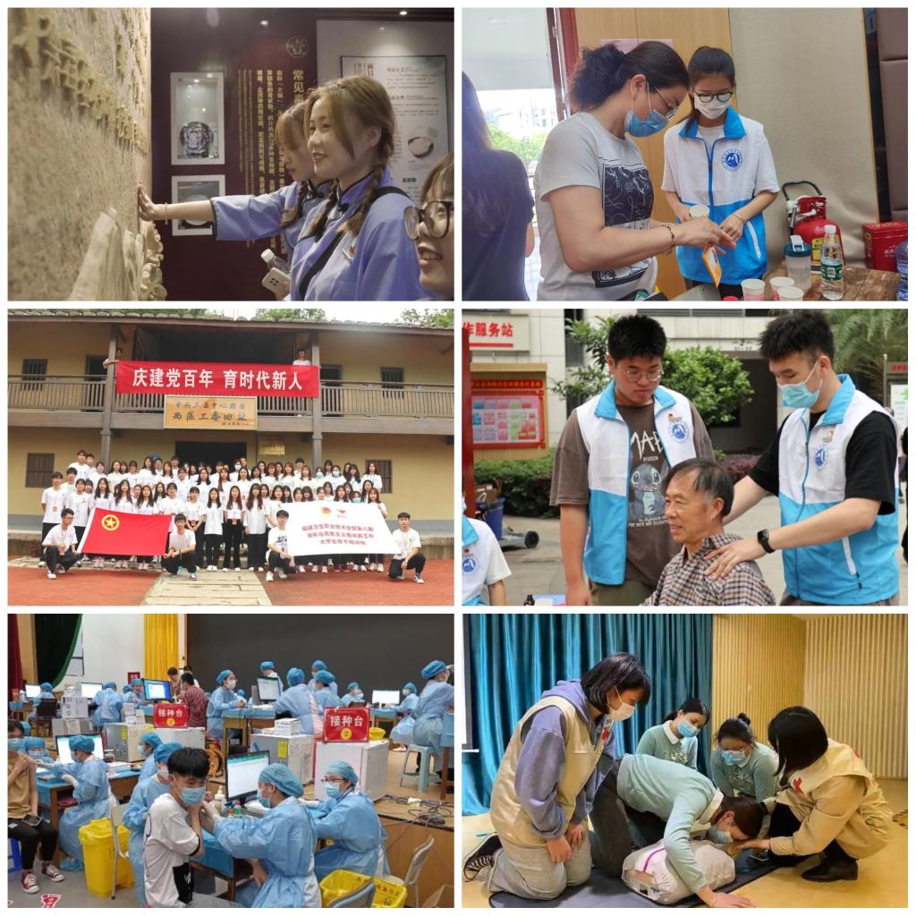 (三)開展“我為群眾/師生辦實(shí)事”實(shí)踐活動。我校學(xué)生志愿團(tuán)前往鋪前社區(qū)開展以“建黨百年守初心,健康義診志愿行”為主題的醫(yī)學(xué)知識、新冠疫苗科普及黨史宣講活動,并對社區(qū)內(nèi)的老人們進(jìn)行測血壓、推拿、刮痧、拔火罐等一系列義診,解決群眾的操心事、煩心事、揪心事,深入基層、服務(wù)百姓,傳遞關(guān)懷和溫暖。此外,我校護(hù)理學(xué)院第二黨支部的老師協(xié)同校紅十字會志愿者前往到福建幼兒師范高等??茖W(xué)校附屬象園幼兒園開展急救知識宣教活動,用知識傳播愛心;青年志愿者走進(jìn)福建農(nóng)業(yè)職業(yè)技術(shù)學(xué)院、福建船政交通職業(yè)學(xué)院開展CPR急救教學(xué)、血壓測量、血型鑒定、中醫(yī)推拿、刮痧、拔罐等活動,用技術(shù)造福師生。