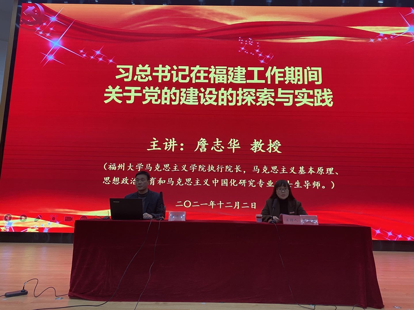 為進(jìn)一步深入學(xué)習(xí)領(lǐng)會(huì)習(xí)近平新時(shí)代中國特色社會(huì)主義思想,特別是習(xí)近平總書記關(guān)于黨的建設(shè)重要論述,2021年12月2日,福州大學(xué)馬克思主義學(xué)院執(zhí)行院長、博士詹志華教授受邀在學(xué)術(shù)報(bào)告廳作題為《習(xí)近平總書記在福建工作期間關(guān)于黨的建設(shè)的探索與實(shí)踐》的專題講座。講座由馬克思主義學(xué)院院長熊美蘭主持,馬克思主義學(xué)院全體教師及醫(yī)學(xué)系師生代表近300人參加。