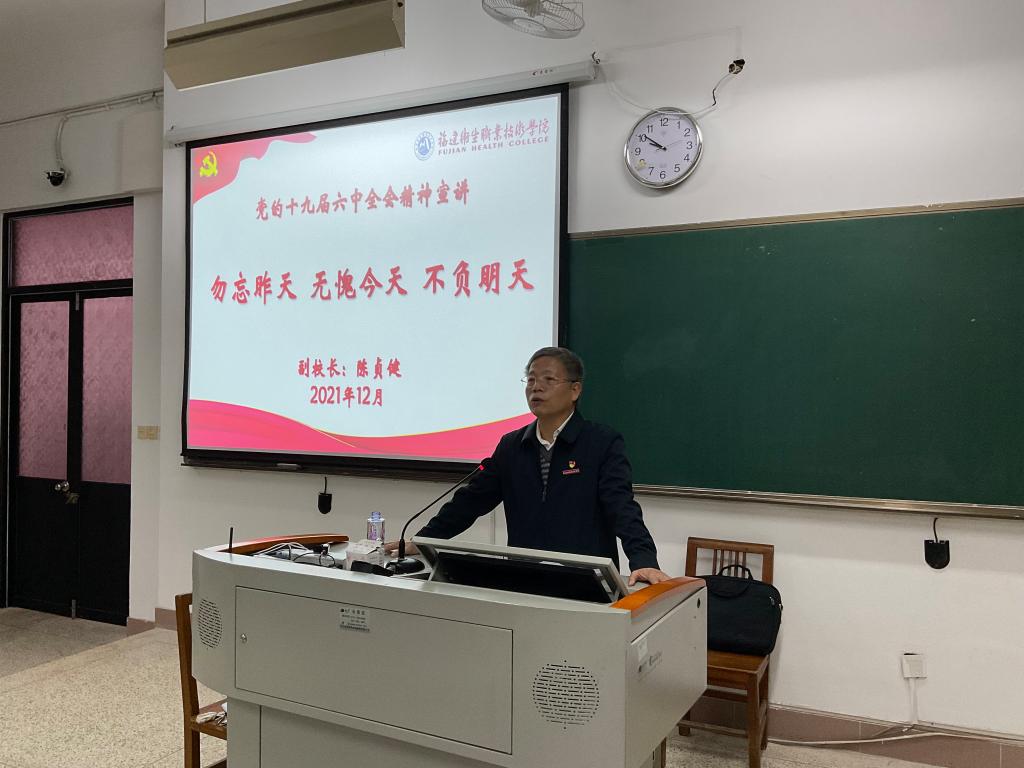 會上,陳貞健對黨的十九屆六中全會精神進(jìn)行系統(tǒng)闡釋,和師生共同回顧了黨的十九屆五中全會以來中央政治局的工作,詳細(xì)講解了黨的百年奮斗的重大成就和歷史經(jīng)驗,以及福建省第十一次黨代會精神。同時,結(jié)合學(xué)校“十四五”發(fā)展目標(biāo),對學(xué)校的遠(yuǎn)景規(guī)劃和發(fā)展做了解讀,勉勵師生賡續(xù)百年初心、筑夢時代浪潮,砥礪奮進(jìn),續(xù)寫新時代閩衛(wèi)院人的故事。