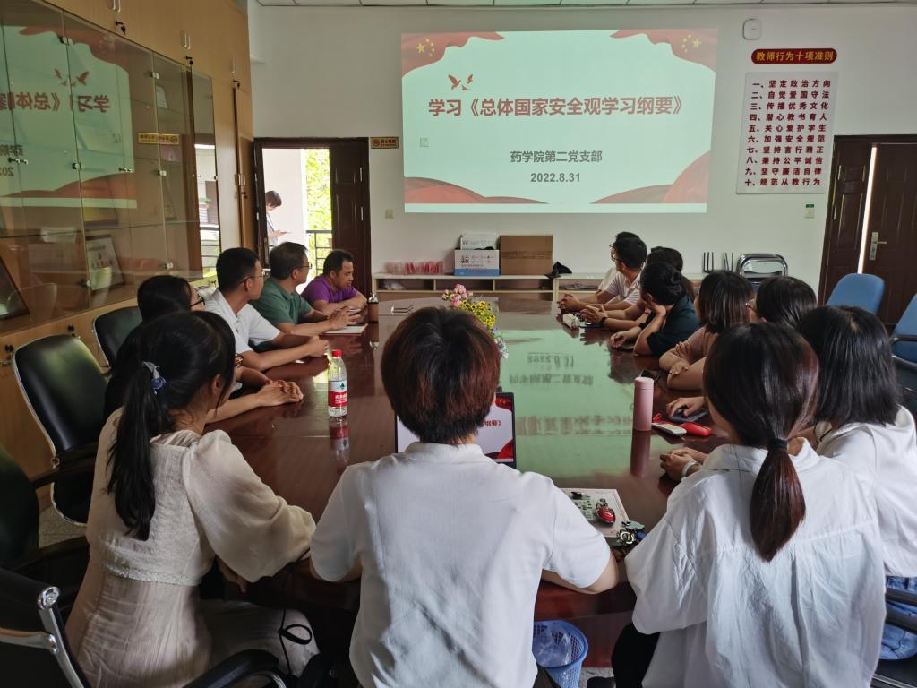 為了牢固樹立總體國(guó)家安全觀,護(hù)航中華民族新征程,2022年8月31日,藥學(xué)院第二黨支部開展主題黨日專題學(xué)習(xí),深入學(xué)習(xí)貫徹《總體國(guó)家安全觀學(xué)習(xí)綱要》(以下簡(jiǎn)稱《綱要》)。支部書記劉丹丹主持此次活動(dòng)。