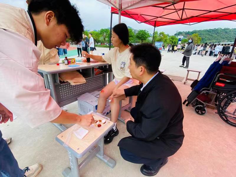 比賽期間,醫(yī)療隊黨員教師及紅十字會志愿者備好應(yīng)急醫(yī)療藥品時刻守護(hù)在賽場旁,對發(fā)生運(yùn)動損傷的運(yùn)動員第一時間進(jìn)行醫(yī)療救治。
