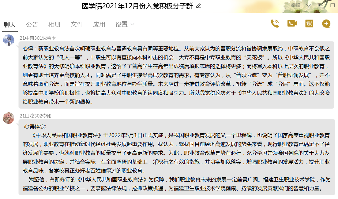 5月11日,醫(yī)學(xué)院第二黨支部采取線上線下相結(jié)合的方式,開展“強(qiáng)學(xué)習(xí)、深思考、重提升--學(xué)習(xí)新修訂的《中華人民共和國職業(yè)教育法》”主題黨日活動,支部全體黨員、入黨積極分子共同參加了此次活動。