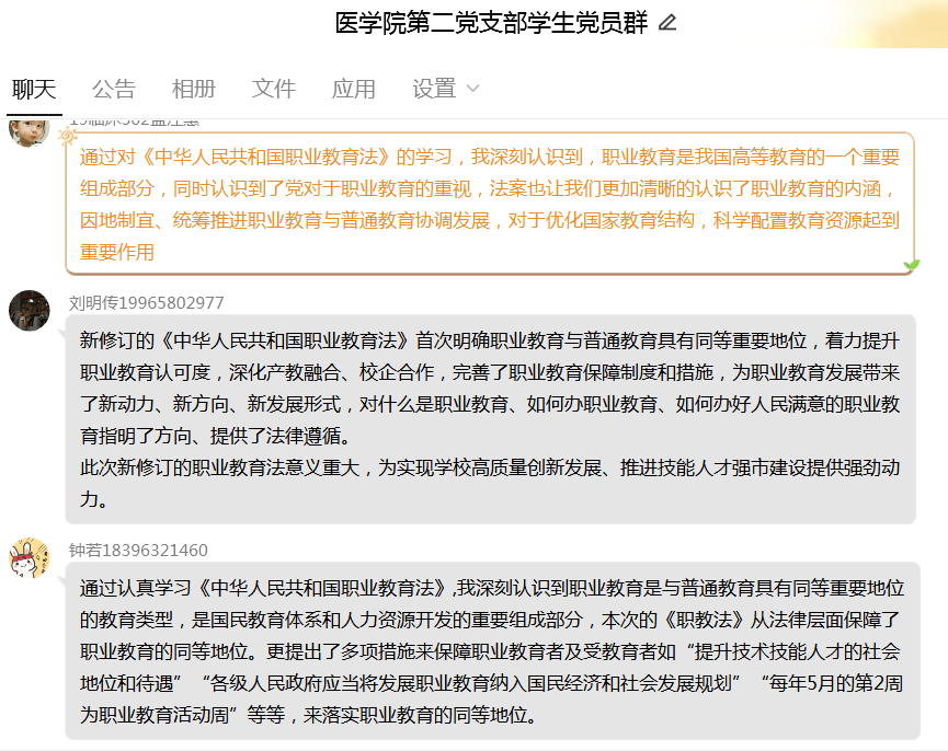 學(xué)習(xí)活動由支部書記高長花主持,她指出,職業(yè)教育是國民教育體系和人力資源開發(fā)的重要組成部分,是培養(yǎng)多樣化人才、傳承技術(shù)技能、促進(jìn)就業(yè)創(chuàng)業(yè)的重要途徑。此次《中華人民共和國職業(yè)教育法》的修訂,深入貫徹了習(xí)近平總書記重要指示批示精神和黨中央、國務(wù)院關(guān)于職業(yè)教育改革發(fā)展的決策部署,系統(tǒng)總結(jié)了職業(yè)教育改革發(fā)展的政策舉措和實(shí)踐成果,進(jìn)一步完善了新時代職業(yè)教育法律制度體系。貫徹實(shí)施新修訂的《中華人民共和國職業(yè)教育法》,對于推動職業(yè)教育高質(zhì)量發(fā)展,建設(shè)教育強(qiáng)國、人力資源強(qiáng)國和技能型社會,推進(jìn)社會主義現(xiàn)代化建設(shè)具有重要意義。