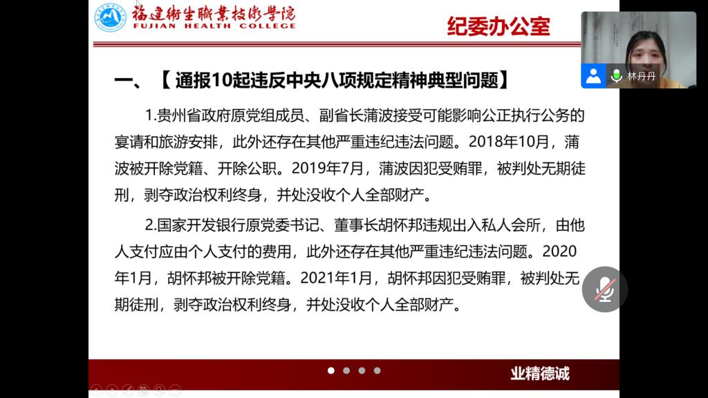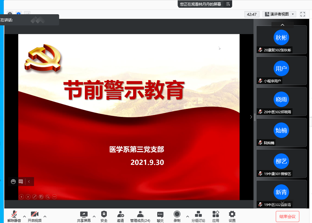 在2021年國(guó)慶節(jié)即將來(lái)臨之際,為增強(qiáng)支部黨員廉潔自律意識(shí),營(yíng)造風(fēng)清氣正的節(jié)日氛圍,2021年9月30日晚,醫(yī)學(xué)系第三黨支部開展“節(jié)前警示教育”。此次會(huì)議由支部紀(jì)檢委員、組織委員林丹丹主持,支部黨員教師們積極參加。