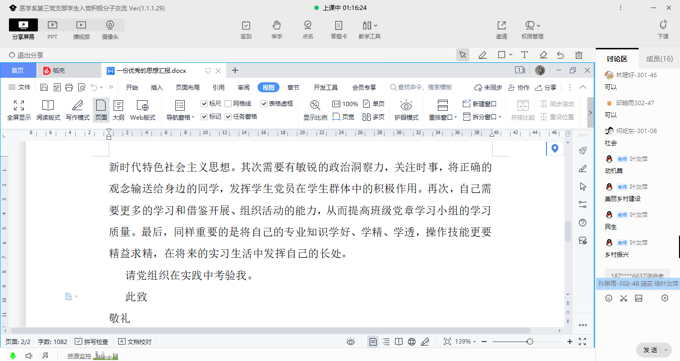 為提高入黨積極分子的思想政治素質(zhì),切實保證新發(fā)展黨員質(zhì)量,2021年9月27日晚,醫(yī)學(xué)系第三黨支部副書記葉汝萍利用騰訊課堂為19級(在實習(xí))、20級(在校)入黨積極分子們在線開展思想?yún)R報撰寫培訓(xùn)。