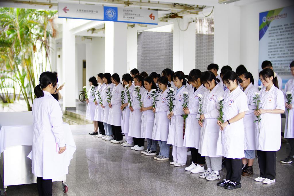 參加活動(dòng)的師生集體行默哀禮,感恩無言良師,隨后大家向大體老師鞠躬并敬獻(xiàn)鮮花,表達(dá)敬意與追思。