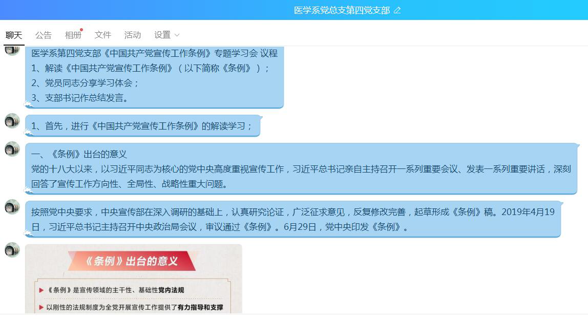 最后,醫(yī)學系第四黨支部書記鄧元榮同志做了總結發(fā)言,表示宣傳工作是黨的一項極端重要的工作,《條例》體現(xiàn)了以習近平同志為核心的黨中央對宣傳工作的高度重視。他要求全體黨員同志要深刻領會貫徹《條例》精神,堅持學用結合,緊密聯(lián)系實際工作,嚴守網(wǎng)絡安全,弘揚正能量,共同做好支部宣傳工作。