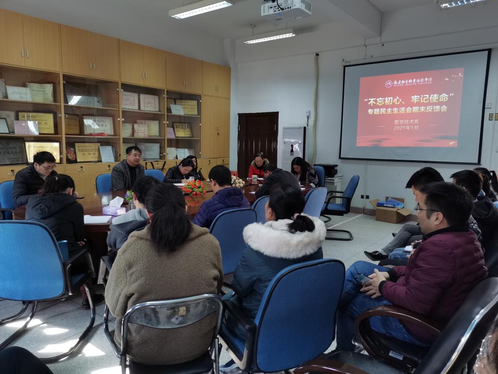 1月14日,醫(yī)學(xué)技術(shù)系在系部會議室召開“不忘初心、牢記使命”專題民主生活會問題整改情況期末反饋會,會議由醫(yī)學(xué)技術(shù)系黨總支書記陳俊穎主持。