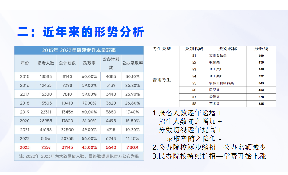 二是近年來的專升本形勢分析,他結(jié)合2015-2023年專升本的報考人數(shù)、錄取率、公辦錄取率以及各個專業(yè)大類的錄取分數(shù)線進行分析,專升本的競爭也越來越激烈。