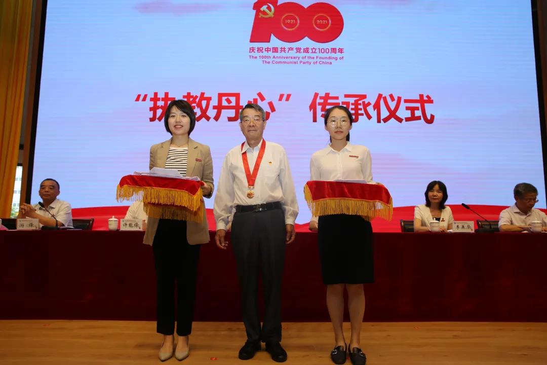 會議首先進行了“光榮在黨50年”紀念章的頒發(fā),之后由獲得紀念章的老黨員教師代表為新入黨的年輕黨員教師代表進行“執(zhí)教丹心”傳承儀式。丹心執(zhí)教數(shù)十載,老黨員教師見證了學校的滄桑變化,傳承給年輕一輩不變的白衣堅守。