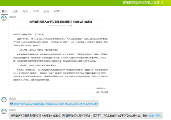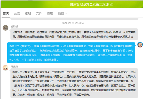 9月24日,健康管理系黨總支第二支部組織全體師生黨員開展專題學(xué)習(xí)交流會,學(xué)習(xí)新修訂的《中華人民共和國教育法》。會議由支部書記張凱捷主持。