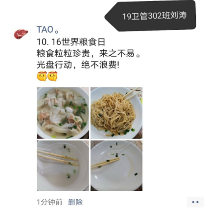 世界糧食日,是世界各國(guó)政府每年在10月16日圍繞發(fā)展糧食和農(nóng)業(yè)生產(chǎn)舉行紀(jì)念活動(dòng)的日子,2021年10月16日是第41個(gè)世界糧食日,為認(rèn)真落實(shí)習(xí)近平新時(shí)代中國(guó)特色社會(huì)主義思想,深入貫徹習(xí)近平總書記關(guān)于糧食安全和厲行節(jié)約、反對(duì)浪費(fèi)系列重要指示精神,增強(qiáng)全社會(huì)愛(ài)糧節(jié)糧意識(shí),更好保障國(guó)家糧食安全,健康管理系黨總支第二支部積極開展“光盤行動(dòng)”打卡活動(dòng),響應(yīng)國(guó)家糧食和物資儲(chǔ)備局的號(hào)召,提升廣大黨員同志愛(ài)惜糧食、杜絕浪費(fèi)的意識(shí)。
