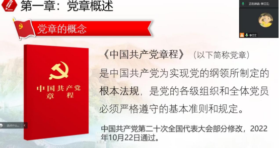 為學(xué)習(xí)貫徹習(xí)近平新時(shí)代中國(guó)特色社會(huì)主義思想,深入了解《中國(guó)共產(chǎn)黨章程》,2月2日下午,健康管理系第九期分黨校青馬培訓(xùn)班第二課:學(xué)習(xí)中國(guó)共產(chǎn)黨章程,全體成員于通過線上舉行,健康管理系團(tuán)總支副書記李江江主講。