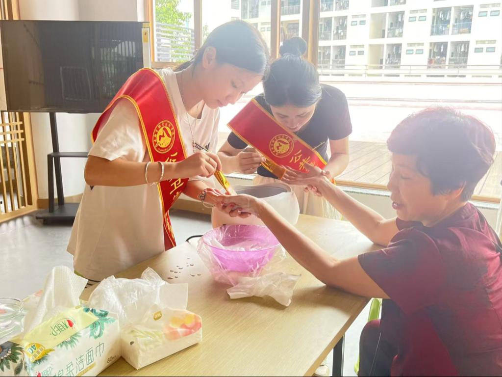 在美兮工作室,退休教師來嘗試蜜蠟手部護(hù)理、AI換妝、超聲波等,給老師們帶來不一樣的感受。 AI換裝讓退休教師們體驗(yàn)各種不同的妝容,讓大家找到適合自己的妝容,蜜蠟手部護(hù)理溫和的祛除角質(zhì)滋養(yǎng)手部為教師們的手部煥膚?;顒又写蠹覠崆楦邼q,既通過自己的勞動表達(dá)了對退休老師的關(guān)懷。