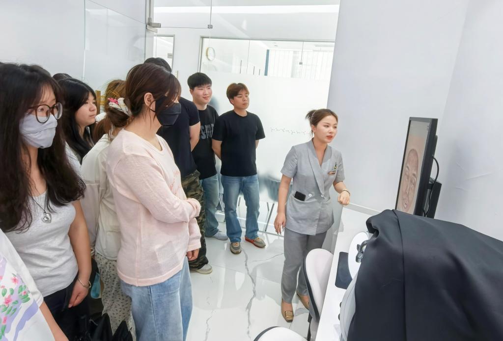 在醫(yī)學(xué)美容技術(shù)專任老師吳若云的帶領(lǐng)下,師生團隊參觀了華窈企業(yè)(窈窕淑女)的門店及實踐育人基地。企業(yè)技術(shù)負責(zé)人詳細介紹了其在醫(yī)學(xué)美容、生活美容領(lǐng)域的創(chuàng)新成果。學(xué)生們通過近距離接觸行業(yè)前沿技術(shù),直觀感受到理論與實踐結(jié)合的重要性。