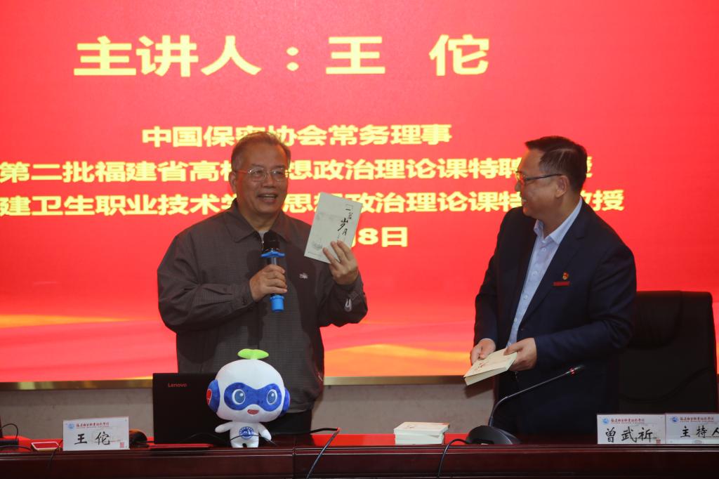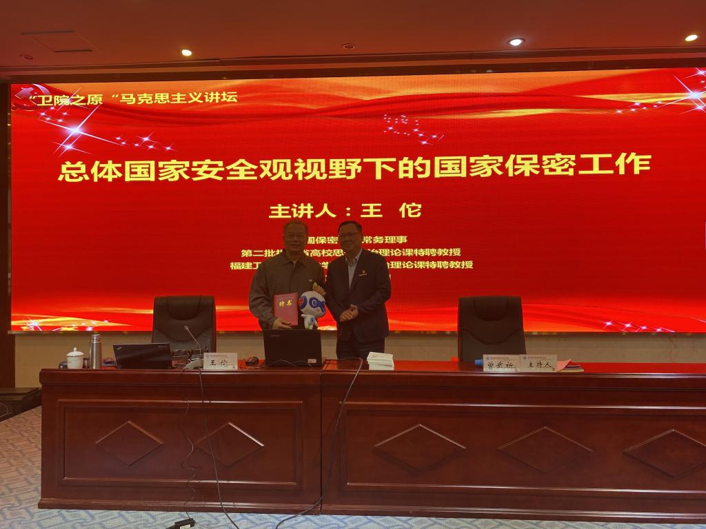 王佗,福建省委辦公廳原巡視員,現(xiàn)為中國國家保密局專家?guī)斐蓡T,中國保密協(xié)會常務(wù)理事。在福建省委辦公廳工作40年,先后從事服務(wù)領(lǐng)導(dǎo)、政策研究、文電信息、值班應(yīng)急、行政保密等工作。出版有關(guān)政策文集若干本。2020年2月王佗被省教育廳、中共省委教育工委聘為第二批福建省高校思想政治理論課特聘教授。我校有幸聘請到王佗擔(dān)任思想政治理論課特聘教授,現(xiàn)場舉行了聘書頒發(fā)儀式。