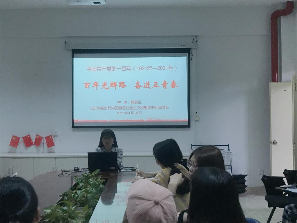 黨史學(xué)習(xí)教育基礎(chǔ)在學(xué)習(xí)、目的在教育,將黨史學(xué)習(xí)教育融于立德樹人全過程。習(xí)近平新時(shí)代中國特色社會(huì)主義思想讀書社原夢(mèng)隊(duì)同學(xué)于2021年4月25日齊聚馬院社團(tuán)研討室,由熊美蘭老師作題為“百年光輝路奮進(jìn)正青春”的專題宣講,引導(dǎo)同學(xué)從百年黨史中汲取智慧和力量,爭做新時(shí)代的奮斗者。