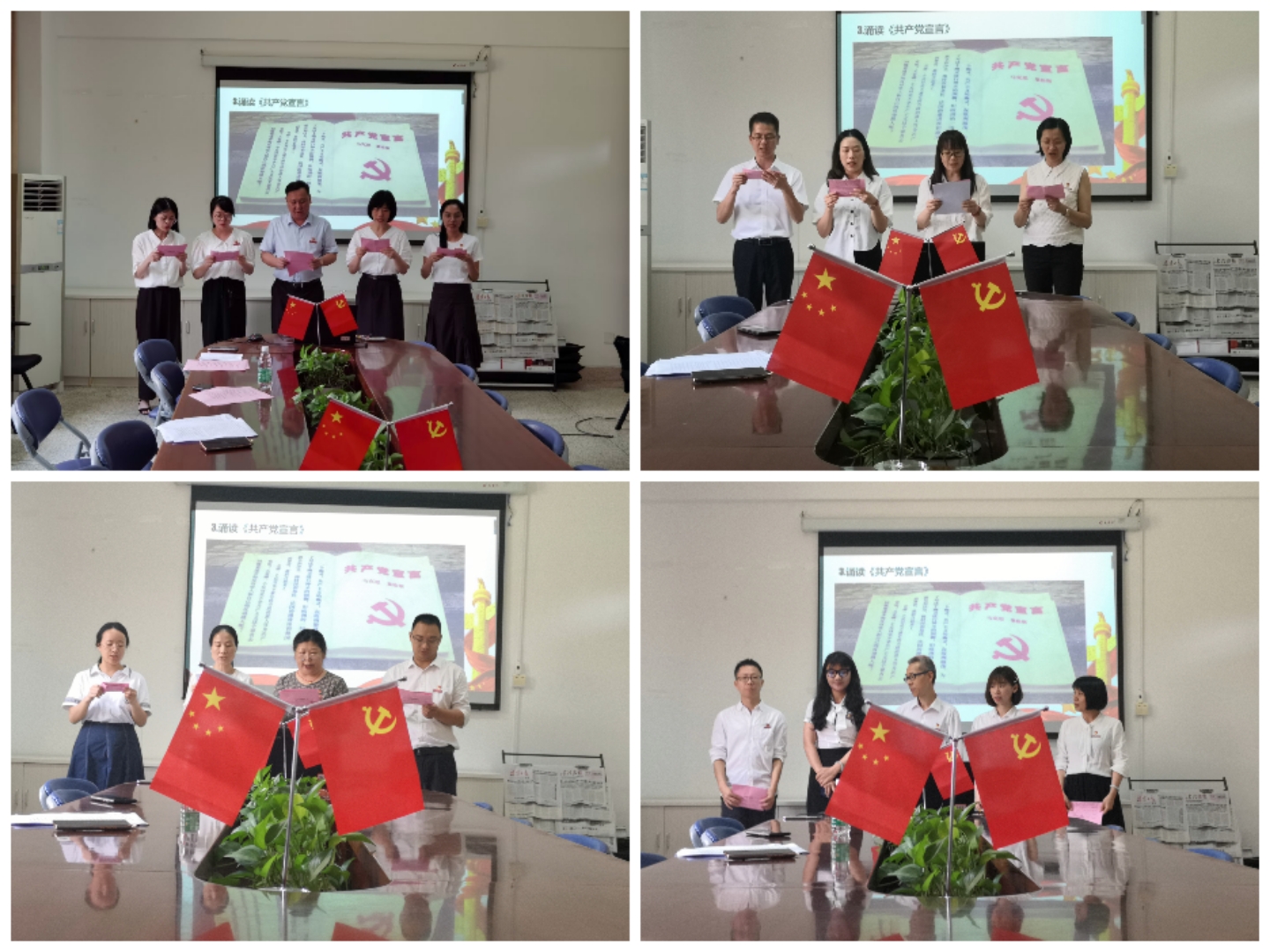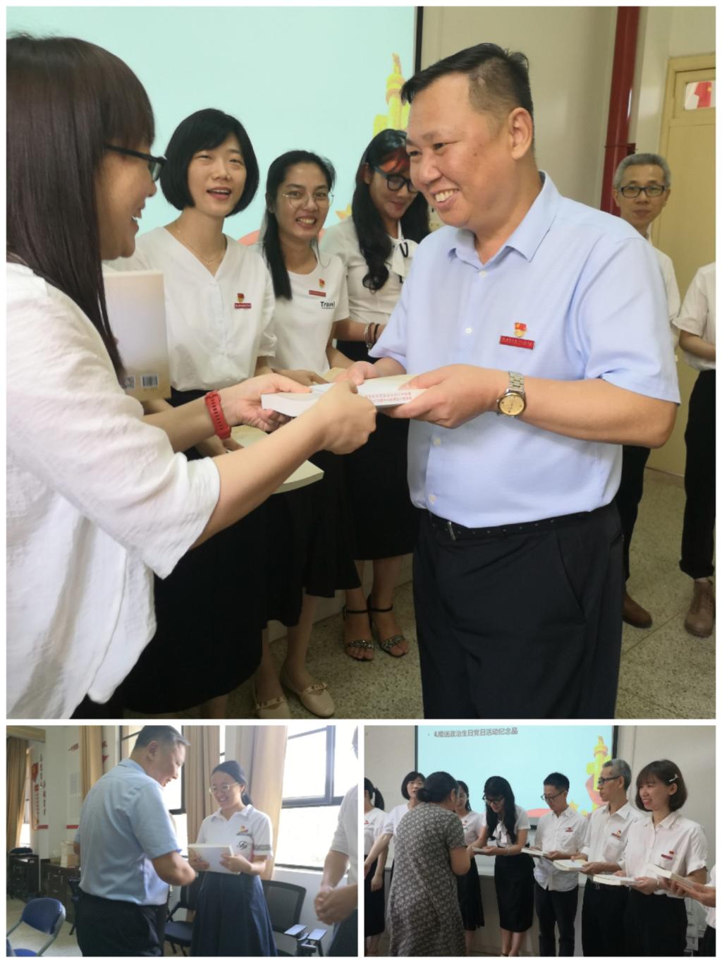 洪流滾滾、百折不撓。在救亡圖存的道路上,信仰是中國共產(chǎn)黨人行穩(wěn)致遠的壓艙石。百年前,陳望道先生翻譯了《共產(chǎn)黨宣言》,革命青年嘗到了“真理的味道”,自此馬克思主義的信仰便從未改變,共產(chǎn)主義成為了一代代共產(chǎn)黨員的共同選擇。黨支部全體黨員共同誦讀《共產(chǎn)黨宣言》,再嘗真理的味道。中國共產(chǎn)黨是馬克思主義學習型政黨,全體黨員要學習科學理論和先進知識。為形成黨支部良好的學習風氣,曾武祈和馬院名譽院長魏立娜向全體黨員贈書。