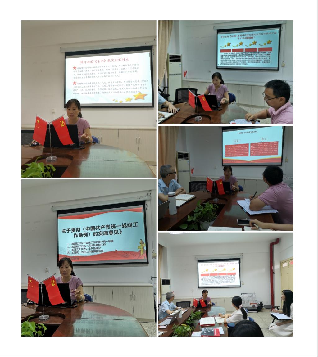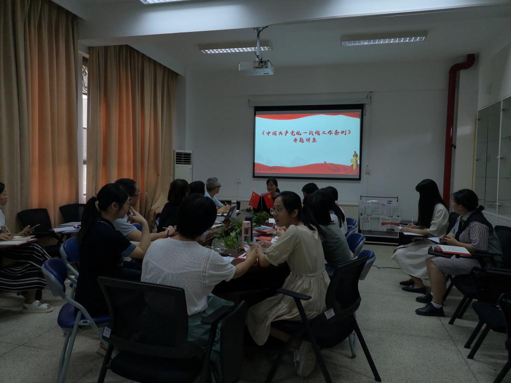 會(huì)上,黨支部開(kāi)展了《中國(guó)共產(chǎn)黨統(tǒng)一戰(zhàn)線工作條例》專題講座,由直屬馬克思主義學(xué)院黨支部副書(shū)記來(lái)朋珍主講。她從《條例》的背景、意義、新時(shí)代具體要求和最突出的特點(diǎn)等方面進(jìn)行解讀。全體黨員同志還進(jìn)一步學(xué)習(xí)了《關(guān)于貫徹〈中國(guó)共產(chǎn)黨統(tǒng)一戰(zhàn)線工作條例〉的實(shí)施意見(jiàn)》。