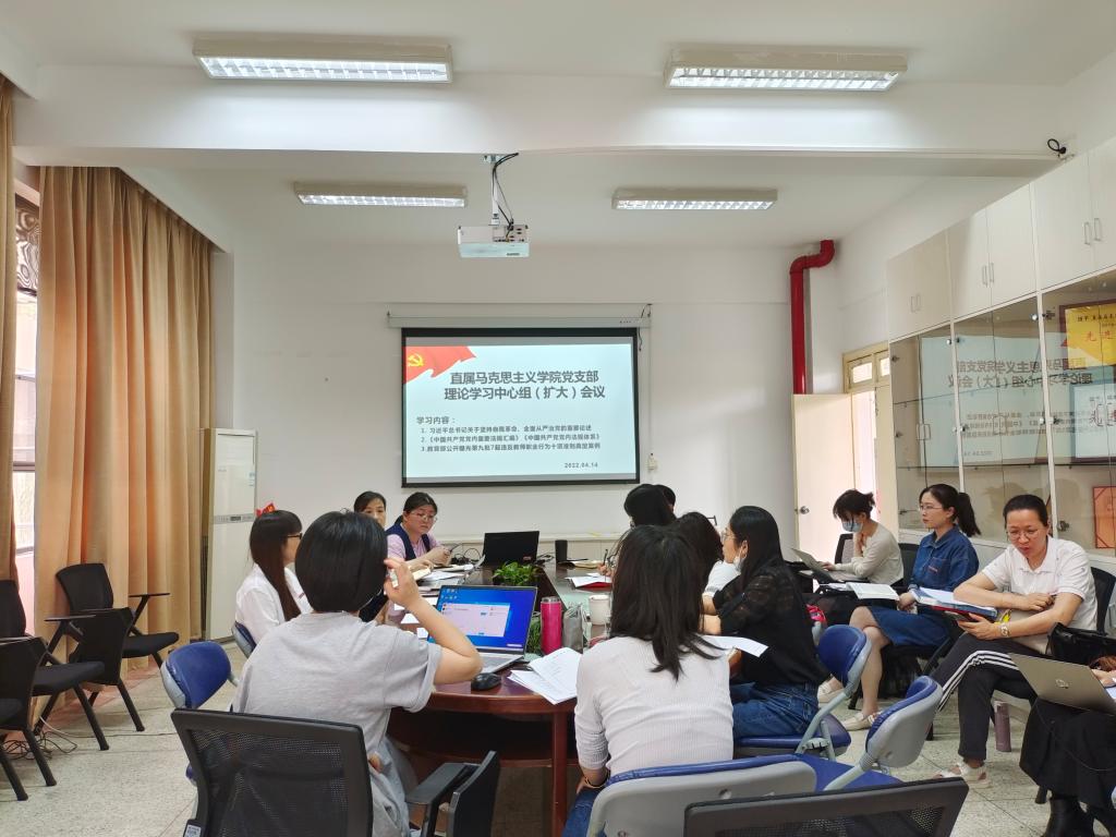 2022年4月14日上午,直屬馬克思主義學院黨支部在107會議室召開中心組學習(擴大)會議,學習《習近平總書記關(guān)于堅持自我革命、全面從嚴治黨的重要論述》《中國共產(chǎn)黨黨內(nèi)重要法規(guī)匯編》《中國共產(chǎn)黨黨內(nèi)法規(guī)體系》《教育部公開曝光第九批7起違反教師職業(yè)行為十項準則典型案例》《打“虎”不歇,防疫不力被問責》等內(nèi)容。本次會議由直屬馬克思主義學院黨支部副書記來朋珍主持。