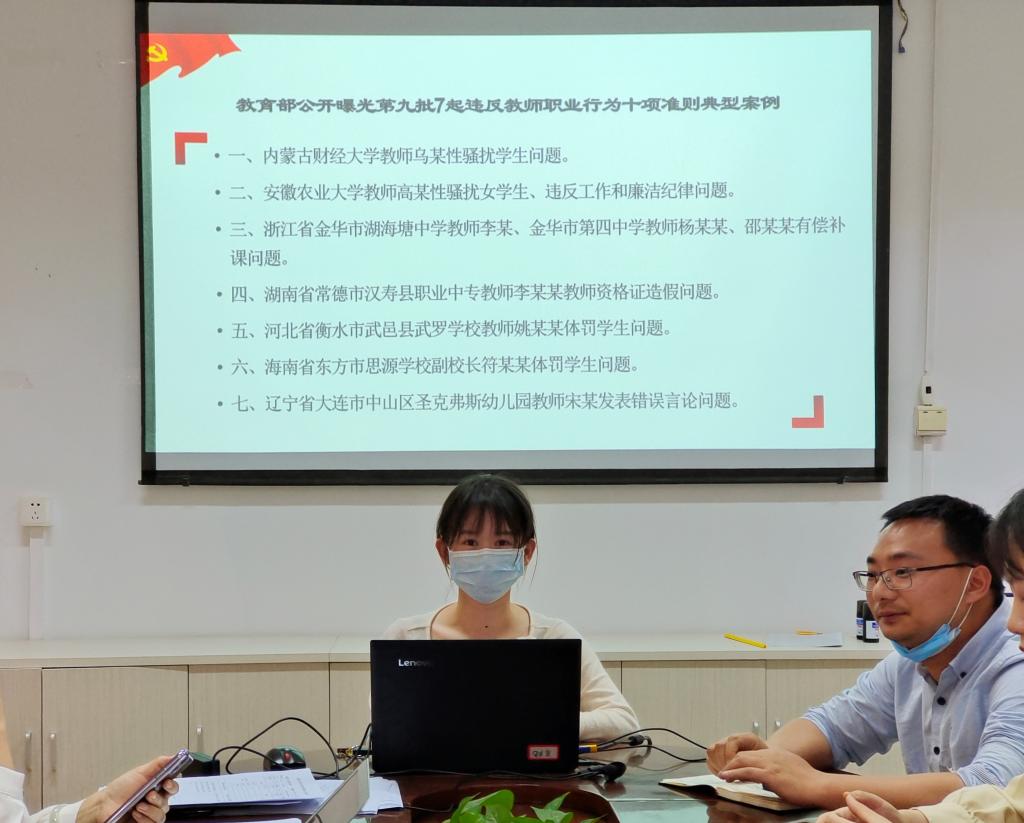 徐舒寧同志分享了《教育部公開曝光第九批7起違反教師職業(yè)行為十項準則典型案例》的心得體會。她強調(diào),作為一名高校思政課教師,必須自覺地加強自身的職業(yè)道德修養(yǎng),既要以學問教人,又要以道德范人。尤其是應不斷加強自身的學術(shù)道德修養(yǎng),做到自覺、自醒、自強、自重、自律,從而提高自己樹立良好師德師風的自覺性,以自己高尚的品德塑造廣大青年學生的人格和品質(zhì)。