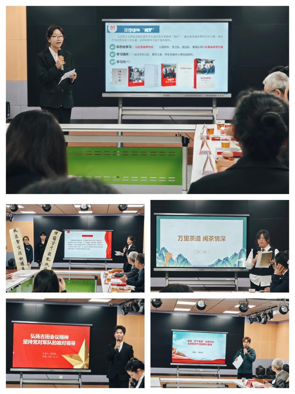 習(xí)近平總書記在福建工作期間開創(chuàng)了豐富的思想財富、精神財富和實踐成果,為福建建設(shè)指明了前進方向。讀書社圍繞這些財富與成果開展一系列社團活動,采擷歸來,阮昱銘、陳泌達(dá)、張晶鈺、鄭佳銘等讀書社骨干社員分別作題為《弘揚古田會議精神 堅持黨對軍隊的絕對領(lǐng)導(dǎo)》《傳承紅醫(yī)精神 賡續(xù)紅色血脈》《萬里茶道 閩茶情深》《發(fā)揚“四下基層”優(yōu)良作風(fēng) 走好新時代黨的群眾路線》的學(xué)習(xí)分享。他們從不同視角,用青年話語,以小見大解讀習(xí)近平總書記在福建的探索與實踐,暢談從中汲取到的成長力量。讀書社社長江月婧從“深挖精神‘富礦’”“深植理論宣傳”“深耕社會實踐”等三方面總結(jié)讀書社作為省級理論社團建設(shè)情況,以“學(xué)習(xí)、傳播、實踐”三條路徑匯報讀書社在校內(nèi)外、在“一站式”社區(qū)開展的系列活動。