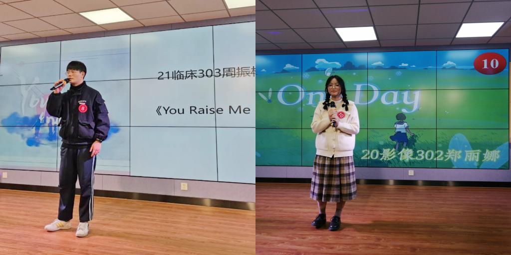 在復賽環(huán)節(jié),選手們演唱了各自擅長的曲目,有的曲風深沉、動人心弦;有的曲調(diào)歡快、引人跟唱。其中,21級臨床301班周振榕同學深情演唱的《You raise me up》,唱出了閩衛(wèi)院學子對父母、對祖國真摯的感恩之情;20級影像301班的鄭麗娜等同學激情演唱《One day》,表達了閩衛(wèi)院學子對世界和平的由衷祝愿。
