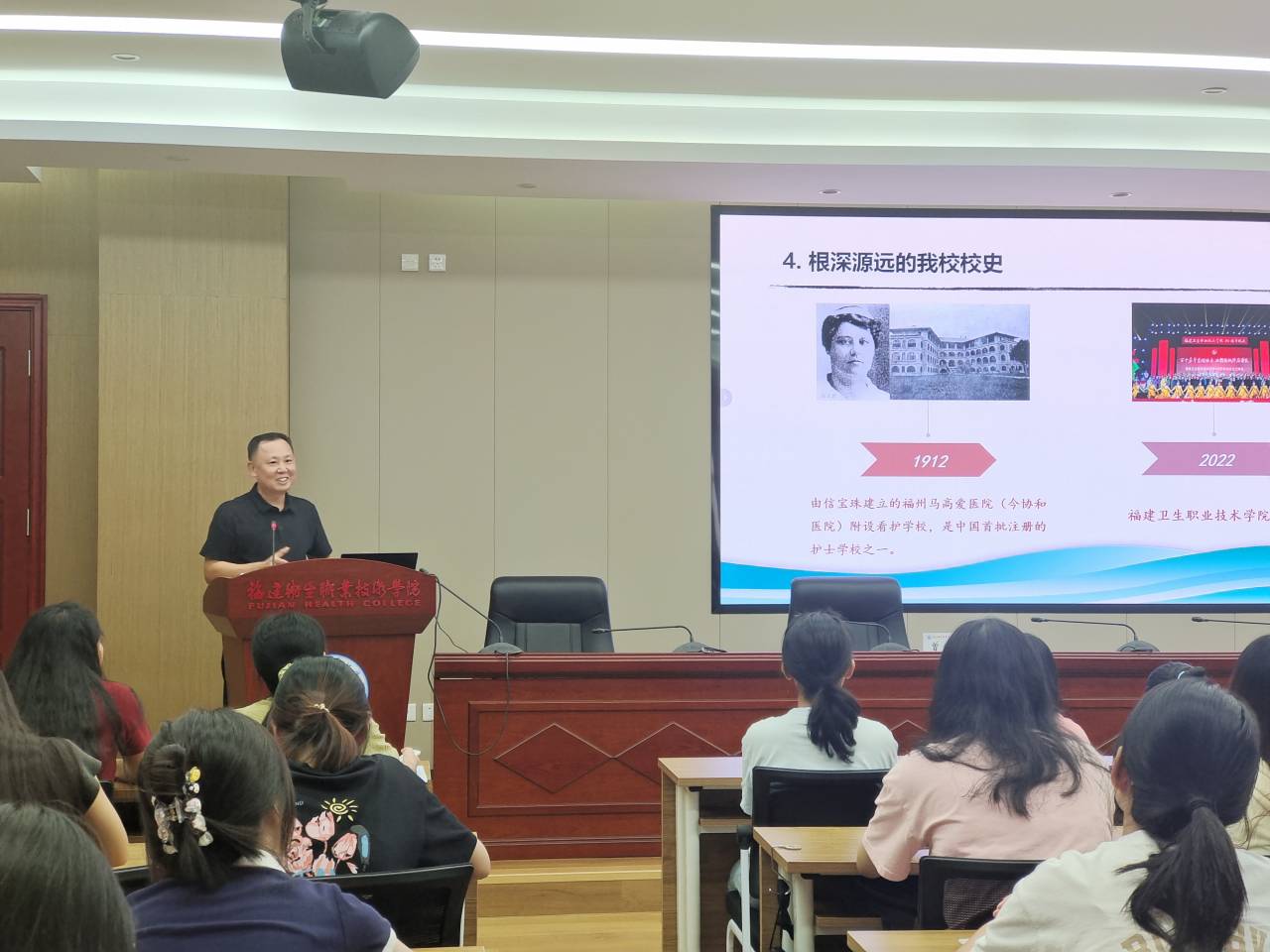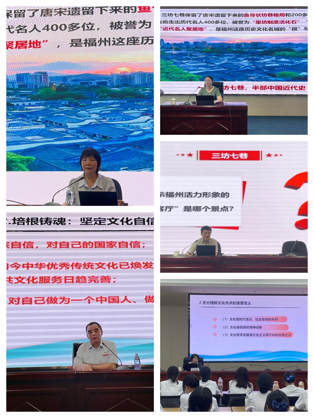 曾武祈以“賡續(xù)歷史文脈 勇?lián)鷷r(shí)代使命 共譜當(dāng)代華章”為題,鮮活地講述了一個(gè)個(gè)動(dòng)人的中華文化故事。從有著“中國城市里坊制度活化石”和“中國明清建筑博物館”美稱的“三坊七巷”,到福建省第一座依托于史前遺址的博物館“曇石山遺址博物館”,再到著名的中國古代神話傳說“神農(nóng)辨藥嘗百草”等,在場師生在沉浸式的聽覺盛宴中掌握到了中華文明的五大突出特性,領(lǐng)悟了新時(shí)代堅(jiān)持文化傳承的重要意義。曾武祈指出,只有深深植根于中華優(yōu)秀傳統(tǒng)文化的豐厚沃土,使歷史中國的深厚底蘊(yùn)與現(xiàn)實(shí)中國的嶄新氣象深相融通,才能有效推動(dòng)中華民族優(yōu)秀傳統(tǒng)文化的創(chuàng)造性轉(zhuǎn)化、創(chuàng)新性發(fā)展;只有不斷追根溯源,從我校百年校史中汲取精神文化命脈,才能培育出文化底蘊(yùn)更深、精神內(nèi)核更穩(wěn)的新時(shí)代醫(yī)學(xué)生。他號召閩衛(wèi)院學(xué)子真學(xué)真知真懂真做,以高度的文化自覺、深沉的文化自信、勇毅的文化擔(dān)當(dāng)肩負(fù)起新時(shí)代新的文化使命。