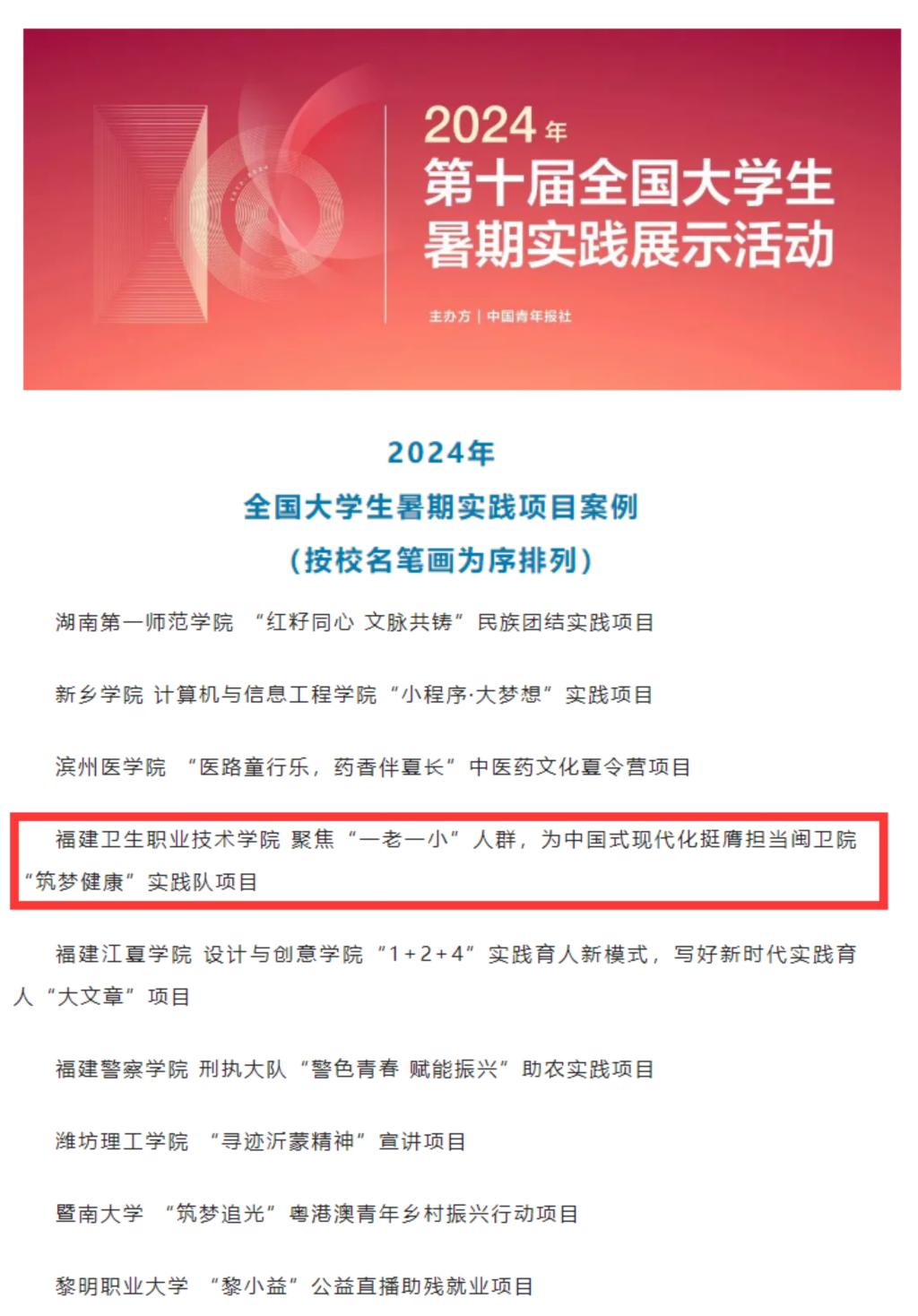 近日,由中國(guó)青年報(bào)社主辦的2024年第十屆全國(guó)大學(xué)生暑期實(shí)踐展示活動(dòng)案例發(fā)布。公共衛(wèi)生與健康管理學(xué)院“筑夢(mèng)健康”實(shí)踐隊(duì)項(xiàng)目——“聚焦‘一老一小’人群,為中國(guó)式現(xiàn)代化挺膺擔(dān)當(dāng)”入選全國(guó)大學(xué)生暑期實(shí)踐項(xiàng)目案例。