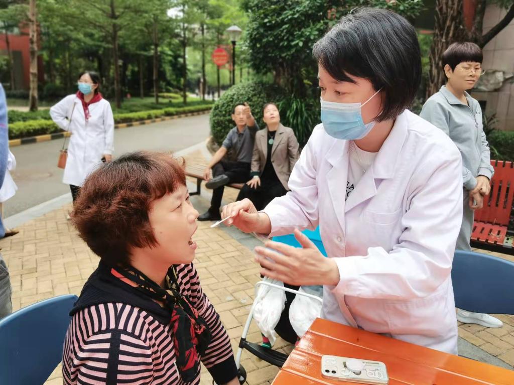 口腔醫(yī)學(xué)專業(yè)的老師們?yōu)樯鐓^(qū)居民特別是小朋友們開展口腔健康檢查,為家長(zhǎng)科普替牙期的常見口腔問題處理方法,并結(jié)合牙齒模型示范正確的刷牙方式,指導(dǎo)居民學(xué)習(xí)愛牙護(hù)牙的口腔健康知識(shí)。