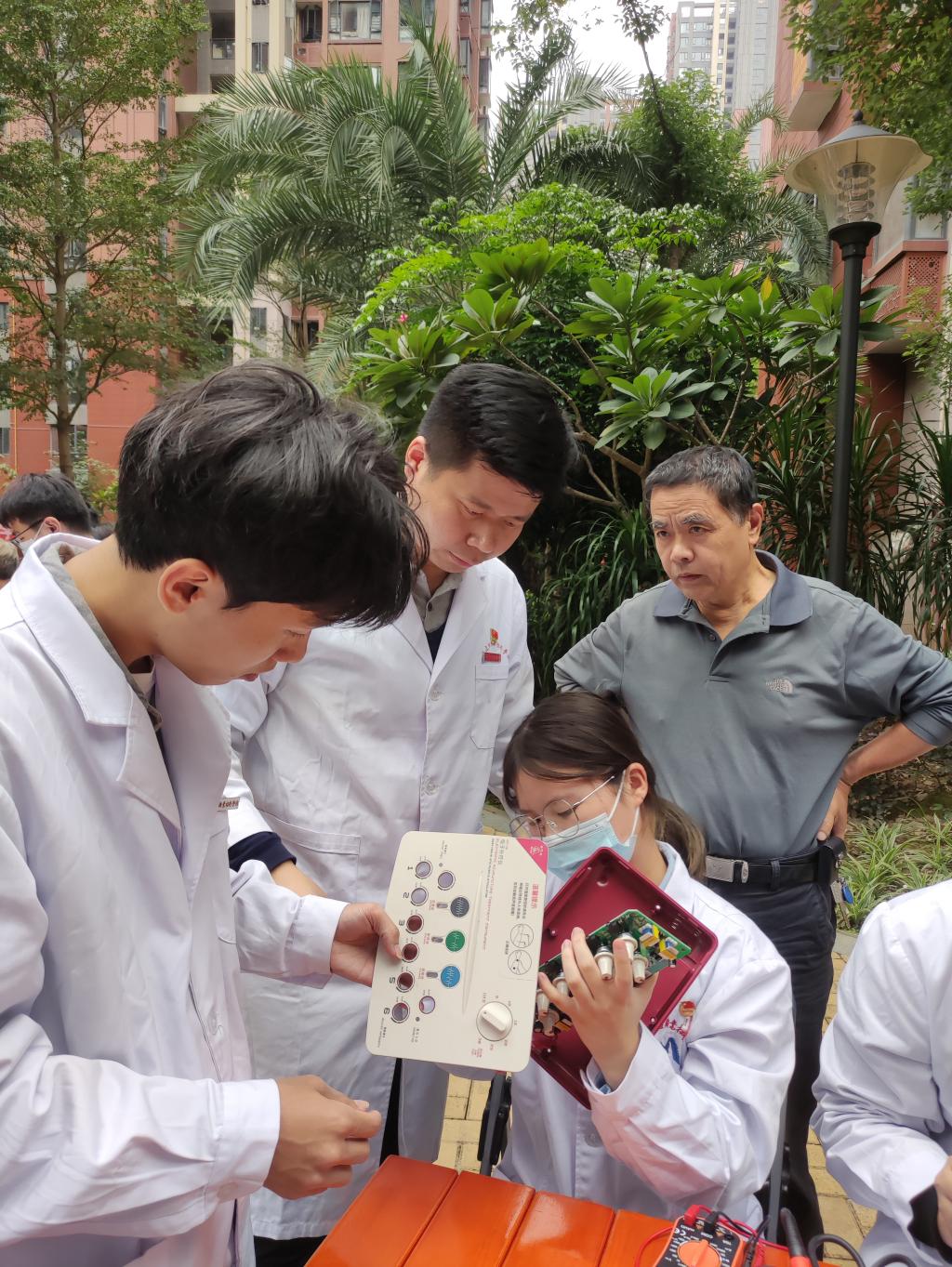 智能醫(yī)療裝備技術(shù)專業(yè)的師生自備專門維修設(shè)備和耗材,為社區(qū)居民維修日常家電,同時(shí)結(jié)合專業(yè)知識(shí)向居民宣傳家用小型醫(yī)療電子儀器的保養(yǎng)常識(shí)。
