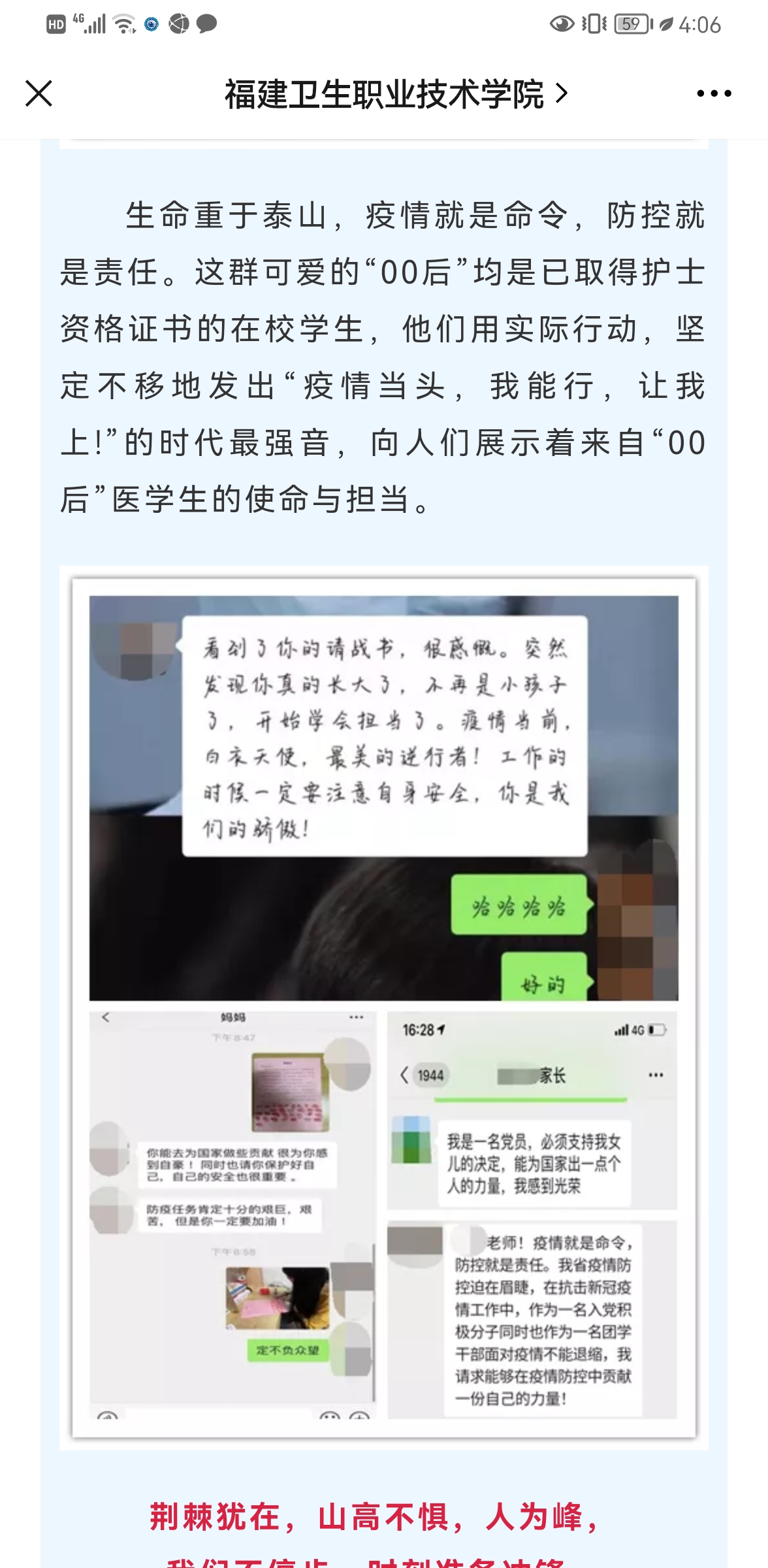 輔導(dǎo)員們還有另一個(gè)身份,他們也是中共黨員,我省疫情發(fā)生以后,他們迅速集結(jié)為學(xué)生管理黨員突擊隊(duì),深入校園疫情防控的各個(gè)角落,關(guān)心學(xué)生的學(xué)習(xí)和生活,為學(xué)生排憂解難,處處飄揚(yáng)著鮮紅的黨旗。在這沒(méi)有硝煙的戰(zhàn)“疫”中,每位閩衛(wèi)院輔導(dǎo)員都心系學(xué)生,沖在前線,守崗履責(zé),踐行著身為一名高校輔導(dǎo)員的初心和使命。相信通過(guò)全校師生的共同努力,我們一定能夠打贏這場(chǎng)疫情防控保衛(wèi)戰(zhàn)。